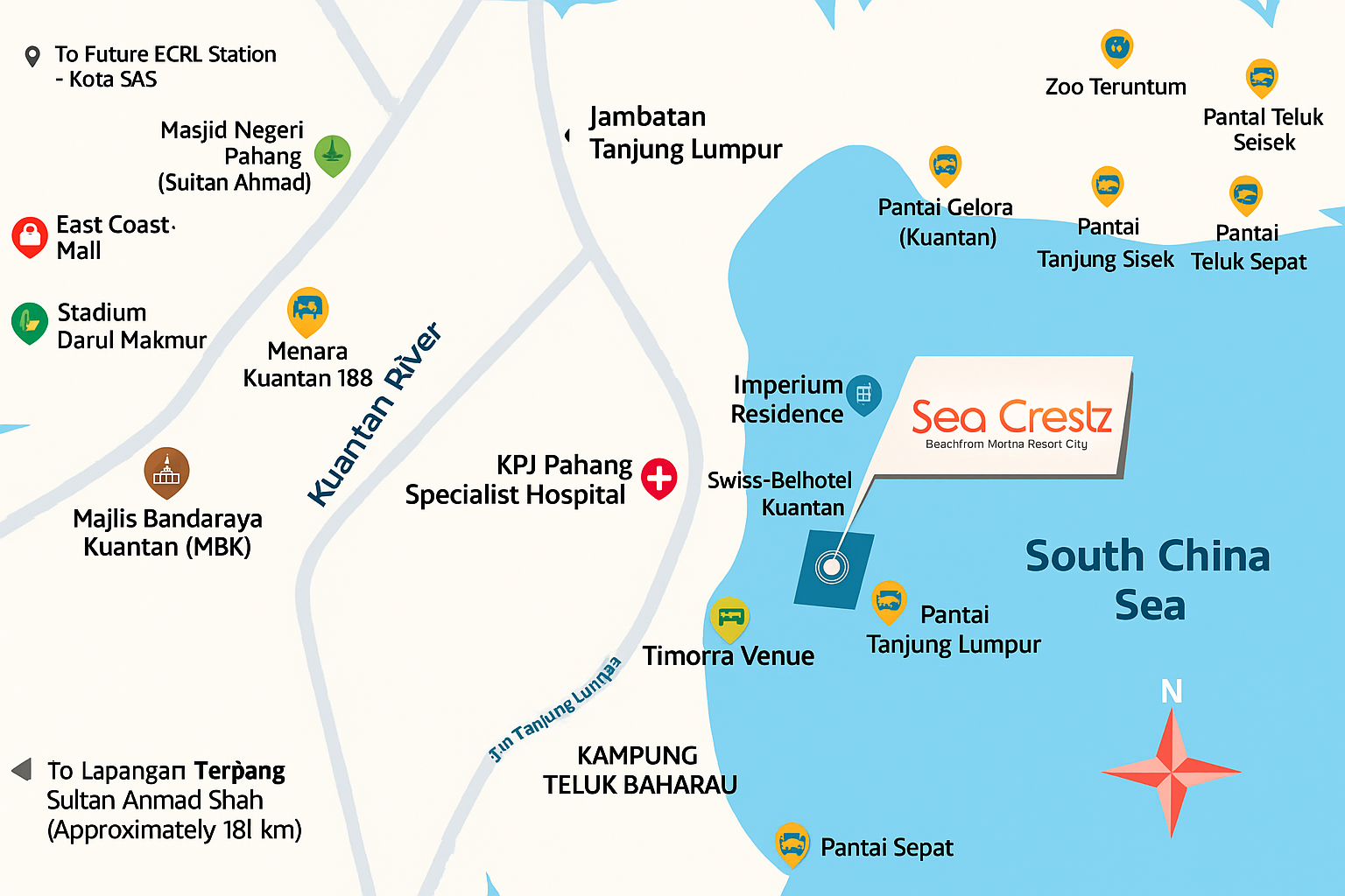 As a proud owner of Sea Crestz oceanfront serviced apartment, you’ll be surrounded by a wealth of nearby attractions that make the most of its exceptional location in Kuantan’s city center. Sea Crestz represents the newest phase of the Kuantan Waterfront Resort City — an exciting large-scale development that spans hectares of prime coastal land. Designed as a vibrant hub for resort living, leisure, and entertainment, this integrated destination is set to redefine Kuantan’s skyline and lifestyle scene. With 456 exclusive units, residents will enjoy direct access to the beach and waterfront dining, along with stunning panoramic views of the South China Sea.